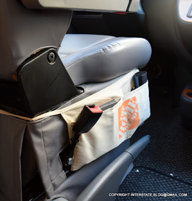 | Organizational win: Tablet holder from Walmart, fits on back of seat head rest. Straps could be used to hold many other objects. About $15. |